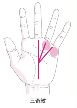 運命線から太陽丘に向かう太陽線と水星丘に向かう財の線が、三方向に大きく分かれる相を持つ人は、人からの信頼が厚く、人気と支持を受け、大きな成功と財を築ける大吉相の人です。この相は、「三奇紋」と呼ばれる大開運の相であり、中には一代で巨万の富を得る人もいます。